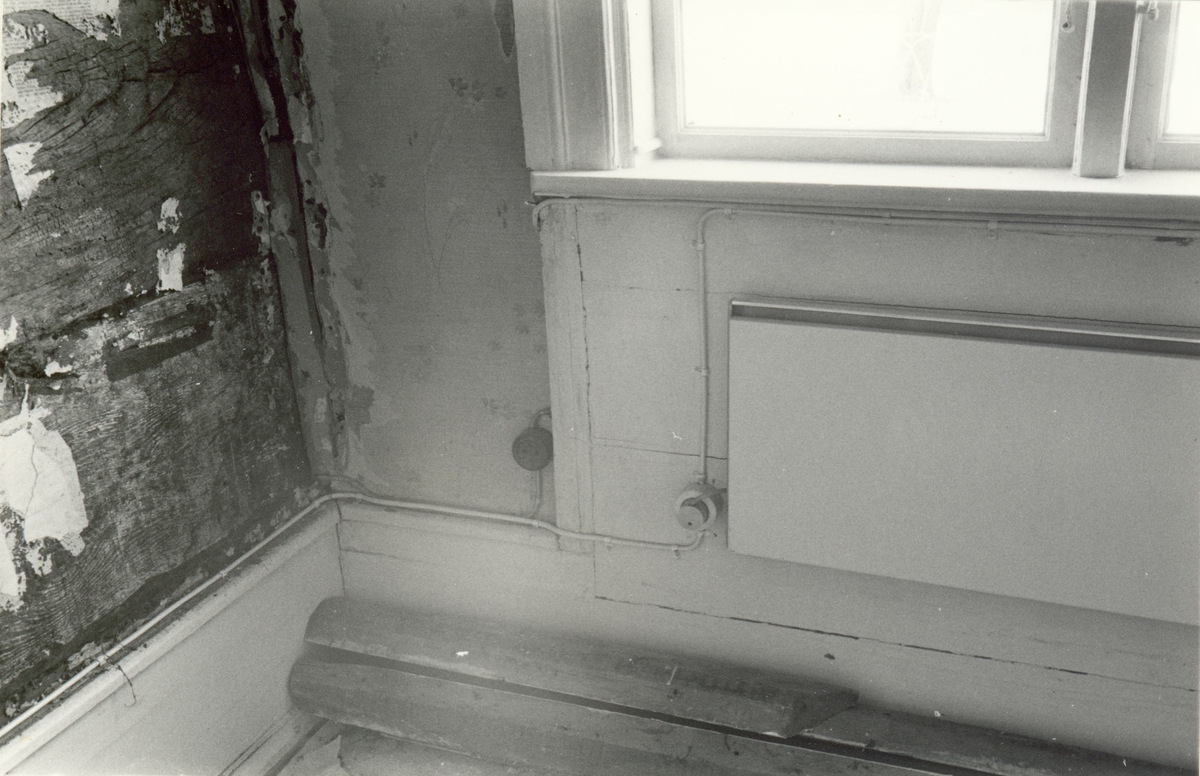 Salen i Krusenstiernska gården. Detalj av pappersfragmenten på ena väggen mellan salongsdörr och fönstervägg.