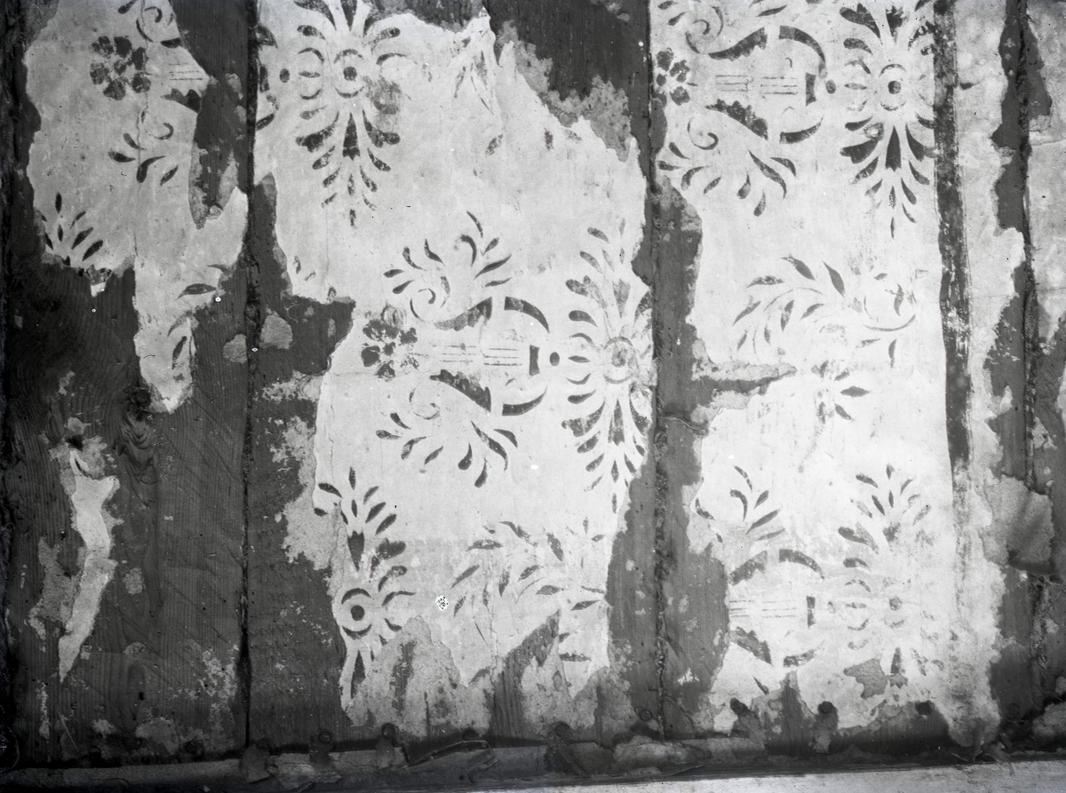 Tapetfragment med gult plus rött på vitt.