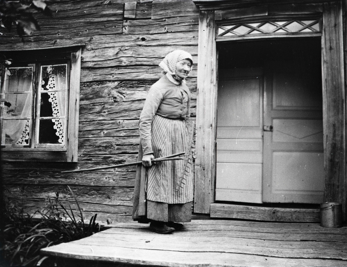 Lena Gren, slöjdare och faktotum (trotjänare) på Högsby prästgård på Löfgrens tid, vid sin stuga som hon själv byggt.