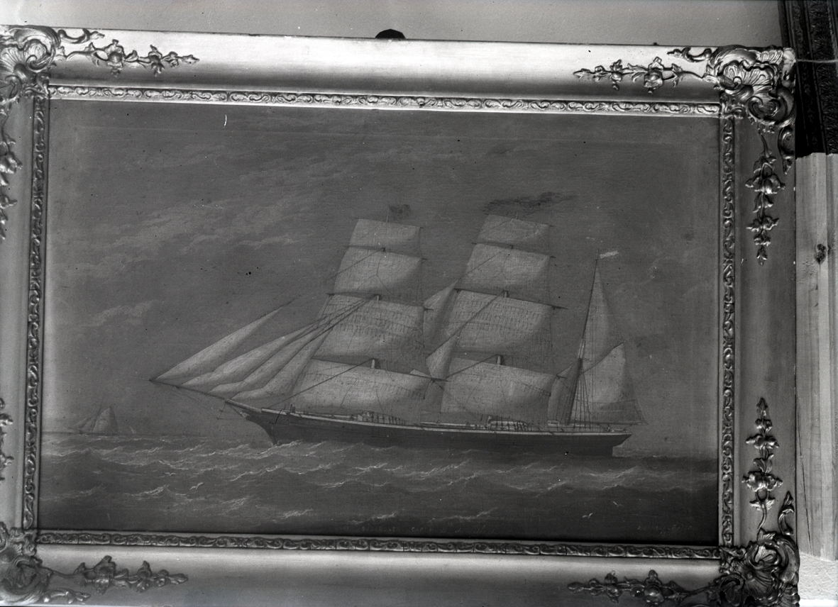 Sjöfröken. Barkskepp. Byggt år 1862 i Västervik för ett stockholmsrederi. Originalmålning. Signerad I. Semple Belfast 1868. Västerviks museum.