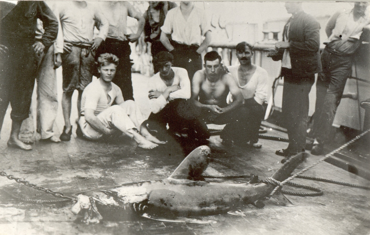 Hajfångst. S/S Beatrice under resa 1923. Bilder från fiskare Lindström, Bräkne-Hoby, som var med i besättningen.