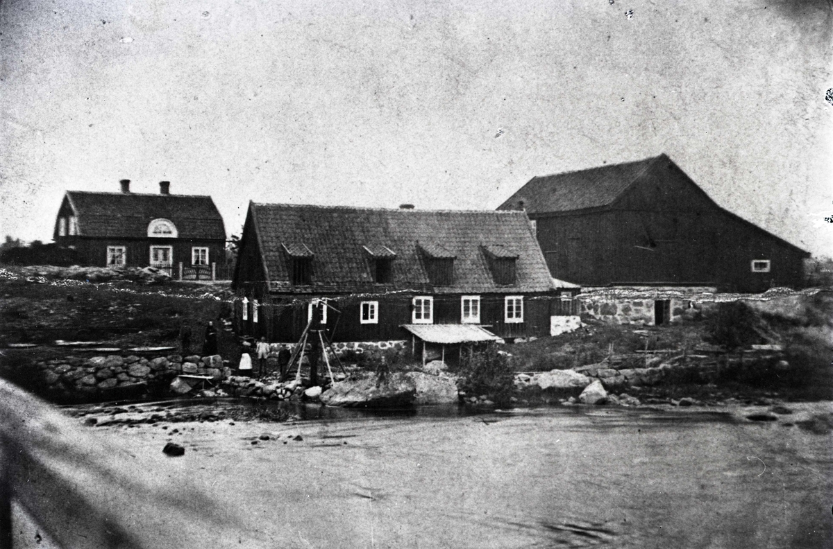 Bostadshus, ekonomibyggnad, stenmur och en å i Broholm.