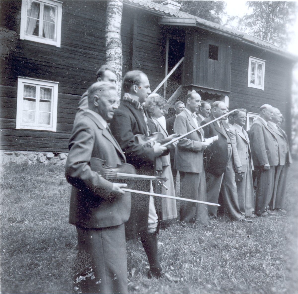 Kalmar läns fornminnesförening hembygdsdag 1949. Folk med fioler.