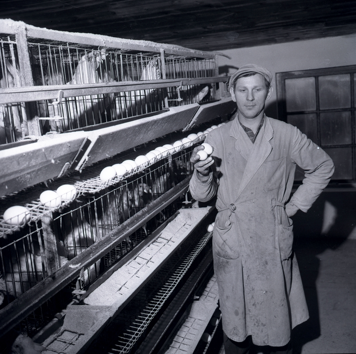 Hönseri. Man som håller i två ägg bredvid ägg och höns i bur. Gunnarslund Ägg AB på norra Öland.