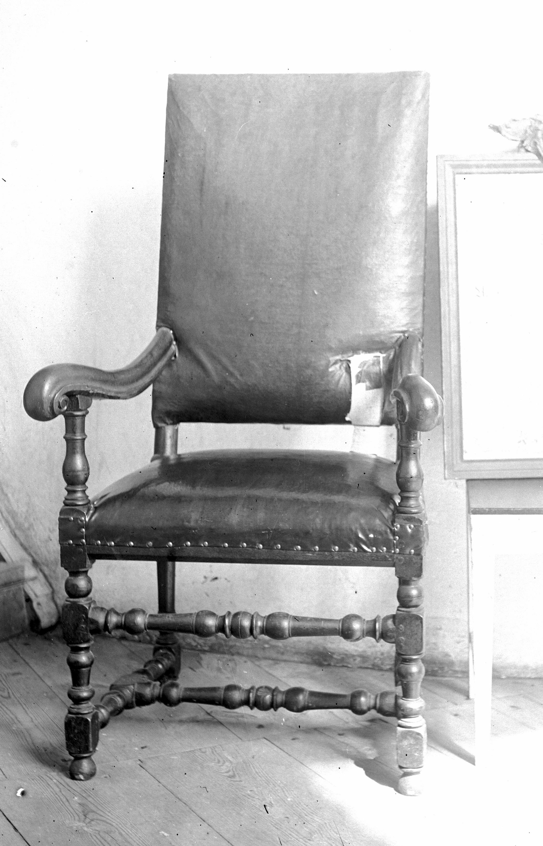 Länsstol av ek och Gustaf III.s tal 21/8 1772 i samtida brunmålad ram, krönt av en snidad katusch med ett målat G3 på blått fält.