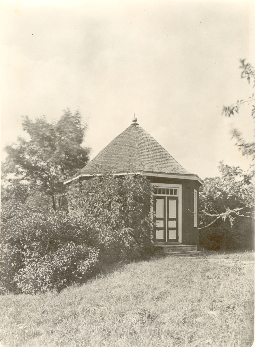 8-kantigt lusthus i trädgården. Vägg slätpanelad, rödfärgad. Spåntak med svarvad kula i toppen.
