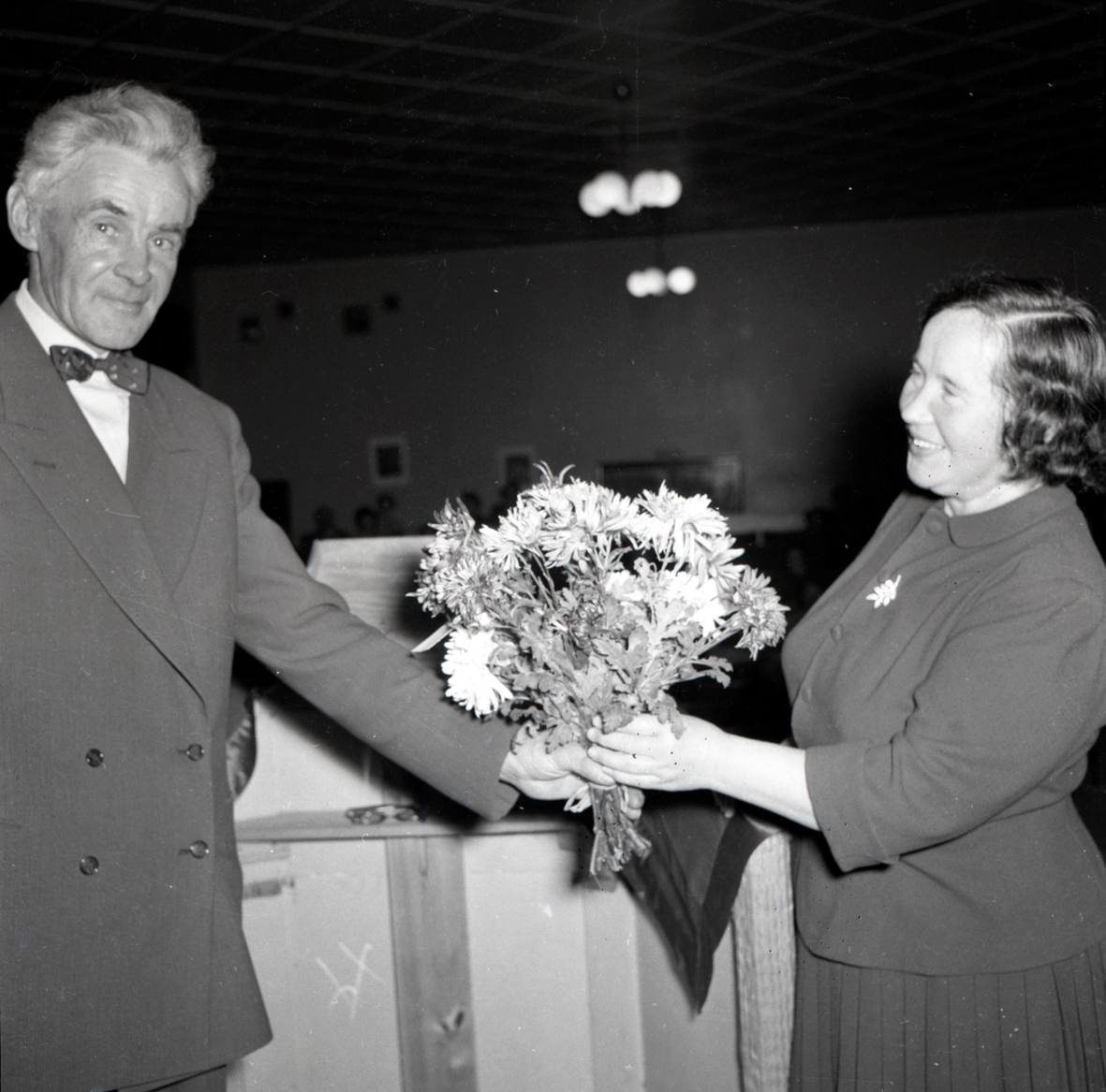 Karl Englund, Valbyrån vid Borgholms stadshus överräcker en bukett blommor till en kvinna.