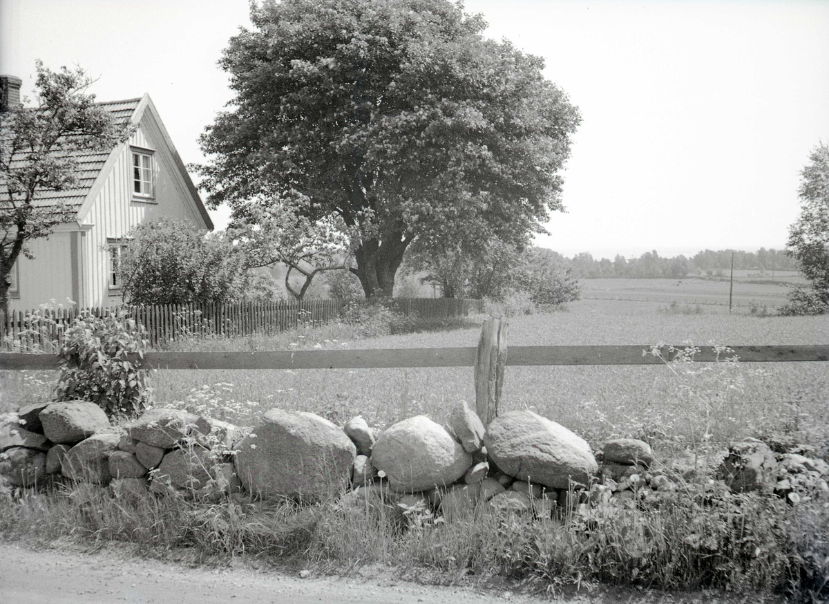 Vy med stenmur i förgrunden ock betesmark till höger.