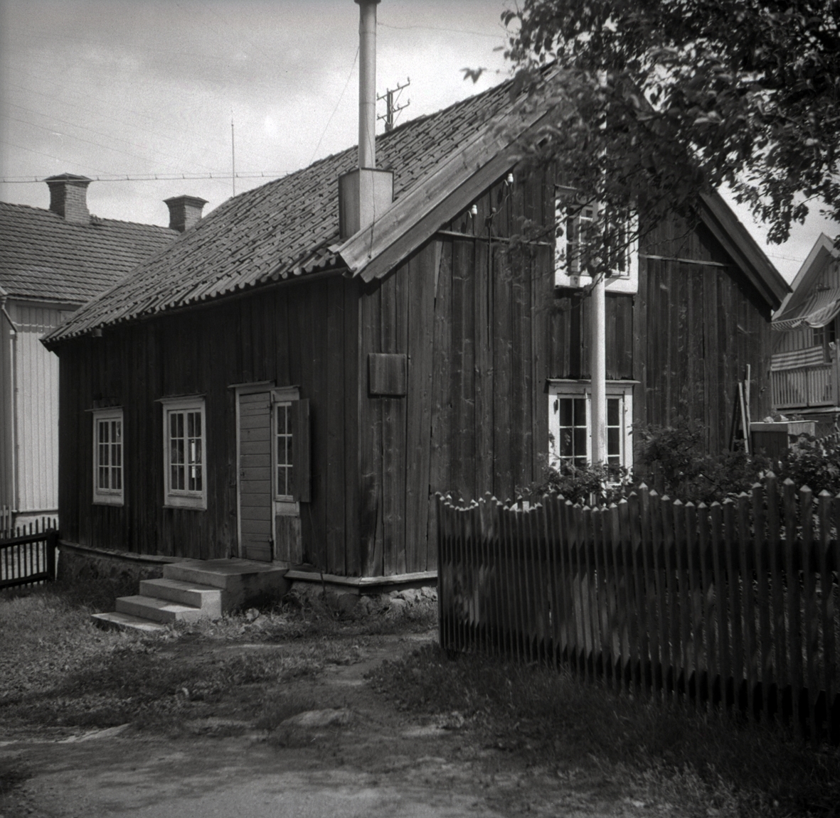 Figeholm, stuga med träfasad sadeltak, trappa och staket.