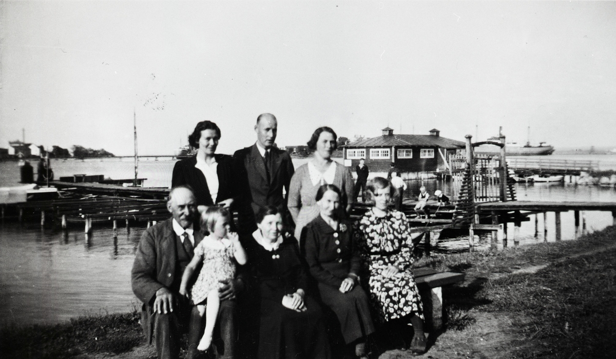 Titel: Personerna på bilden är okända. Intressant med bilden är den långa båtbryggan med grind.