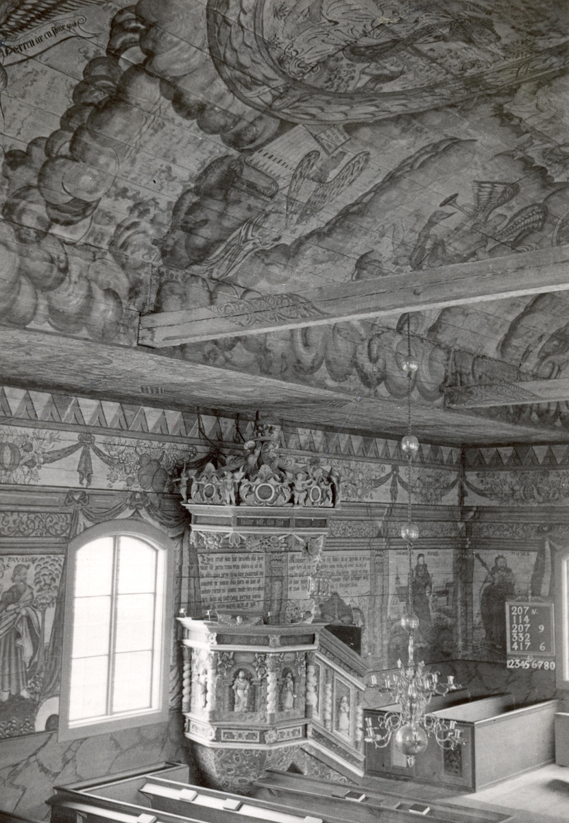 Predikstol och tak samt väggmålningar i kyrkan till Djursdala socken.