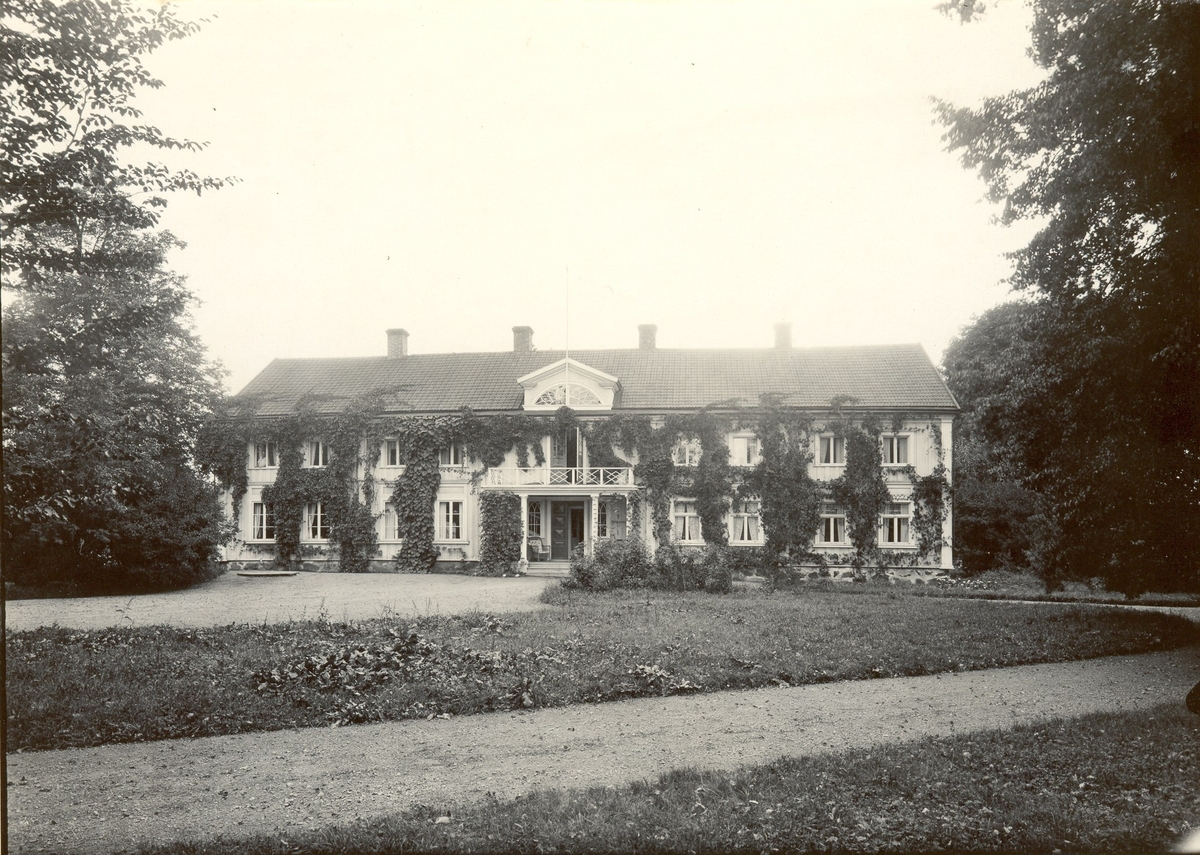 Syserums säteri. Huvudbyggnaden åt gården, gulmålad. På trädgårdssidan en stor veranda ("dansverandan"). Hög bottenvåning, övervåningens rum betydligt lägre.