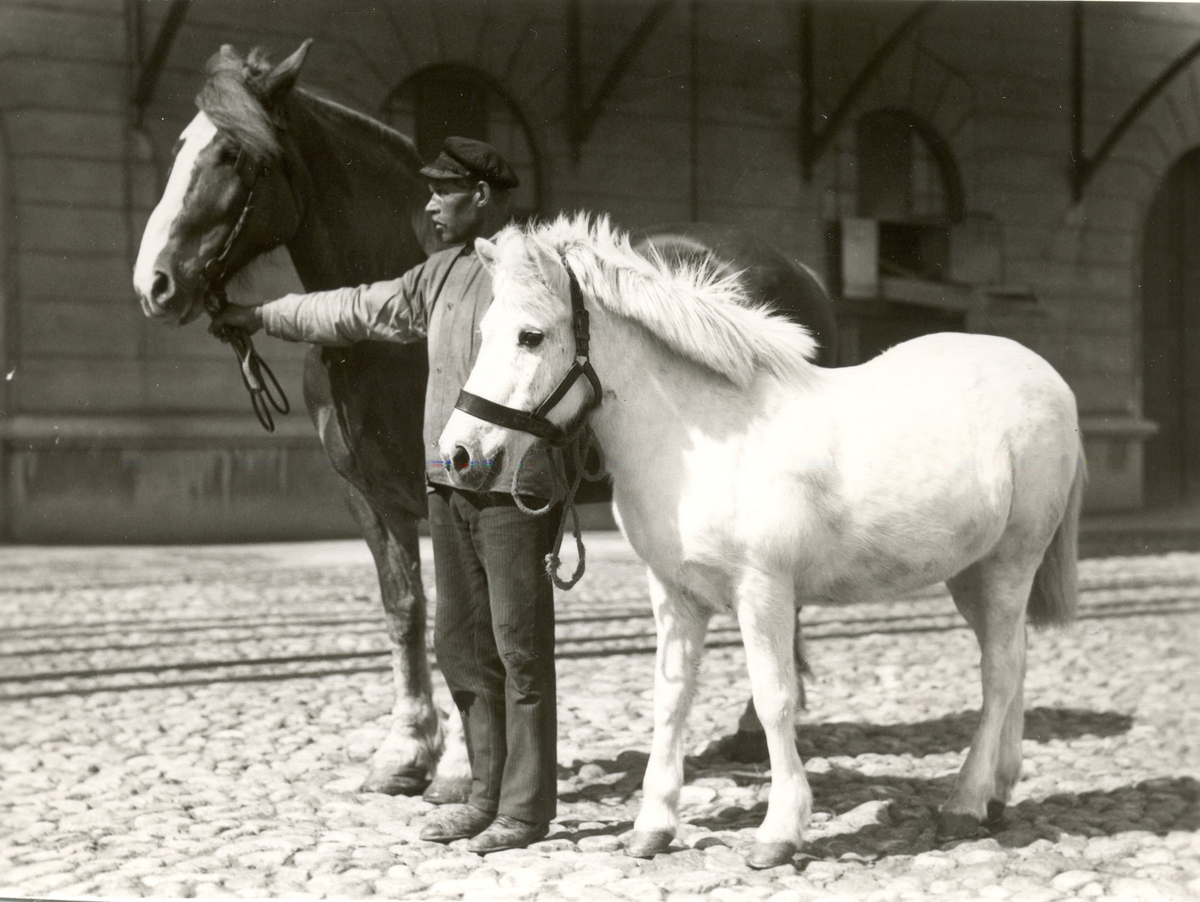 Två av Kalmar Ångkvarns hästar utanför kvarnen när de skulle medverka i Barnens dags karnevalståg omkr 1932-35.