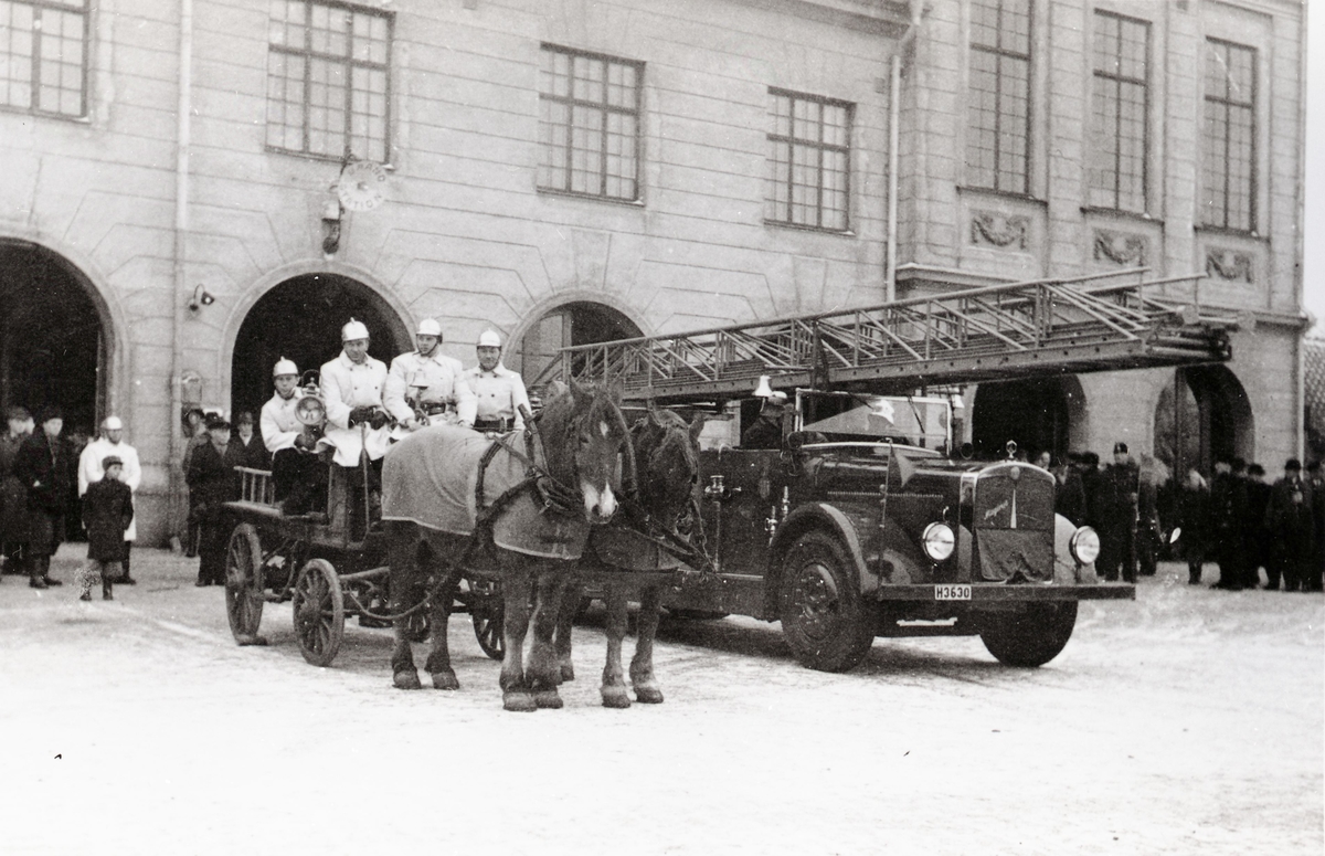 Hästarna Balder och Freja jämte den stora stegbilen utanför brandstationen.