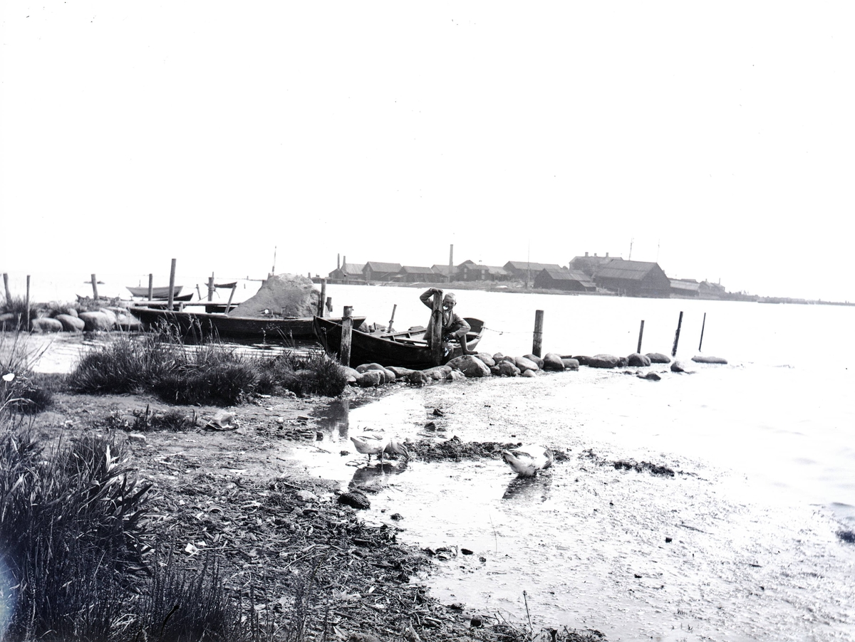 Vy med båtar, vågbrytare av stenar och Varvsholmen i bakgrund. Utsikt från Ängö mot Varvsholmen.