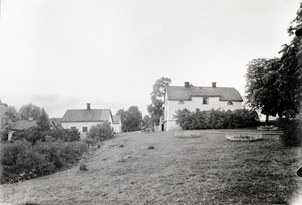 De tre flygelparen, från sydost. Längst till höger skymtar huvudbyggningen. Vita, putsade trähus.