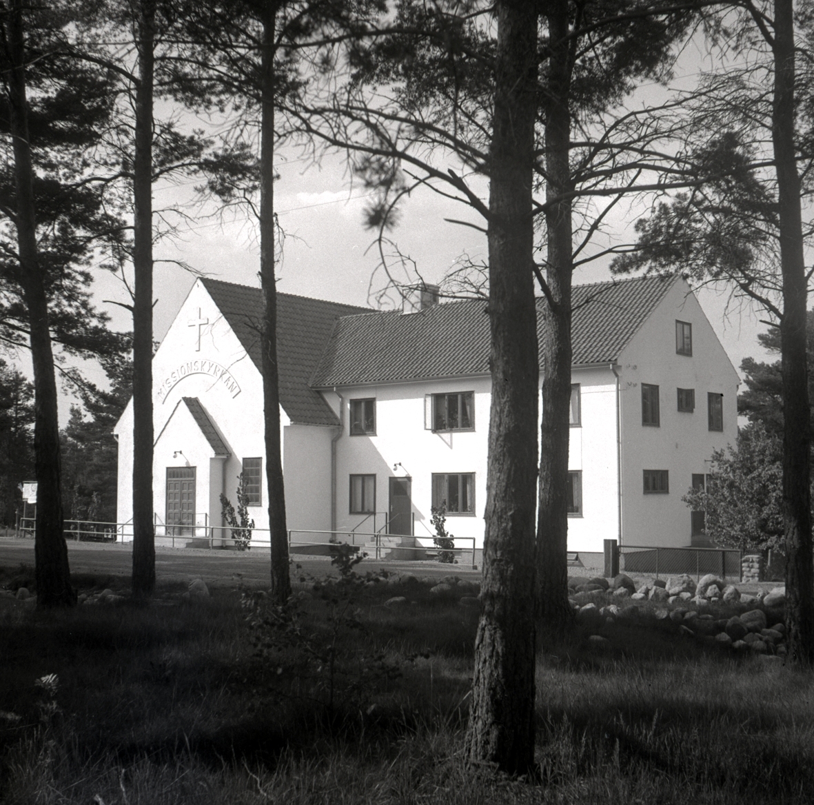 Bakom träden syns missionskyrkan i Blomstermåla.