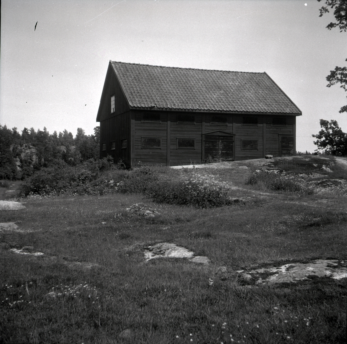 Magasinsbyggnad med liggande timmer och sadeltak i Rumma.