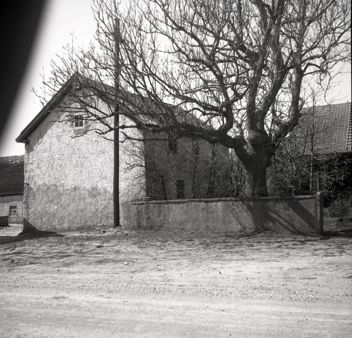 Ekonomibyggnad med putsad fasad och sadeltak i Halltorp.