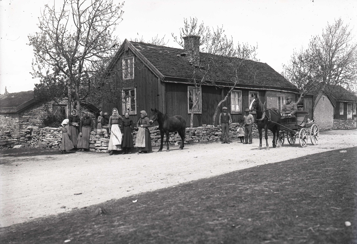Grupporträtt från Stenåsa 1904. Dessa bilder syftade till att visa att familjen var välmående. Hela familjen ställdes upp framför huset tillsammans med de viktigaste husdjuren. Här kan vi se att familjen hade en liten häst, troligen en Ölandshäst, och en stor varmblodshäst som är spänd framför en åkvagn. Då kusken verkar ha uniform är det möjligt att familjen drev droskverksamhet.