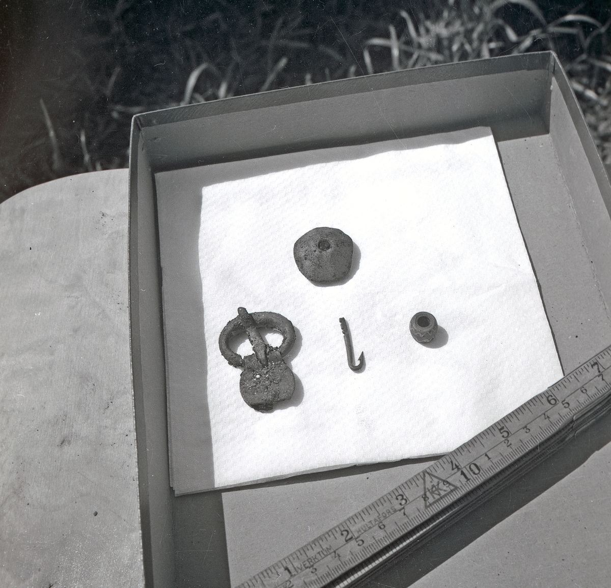 Fynd från Skedemosse. En metkrok, en sländtrissa och ett spänne.