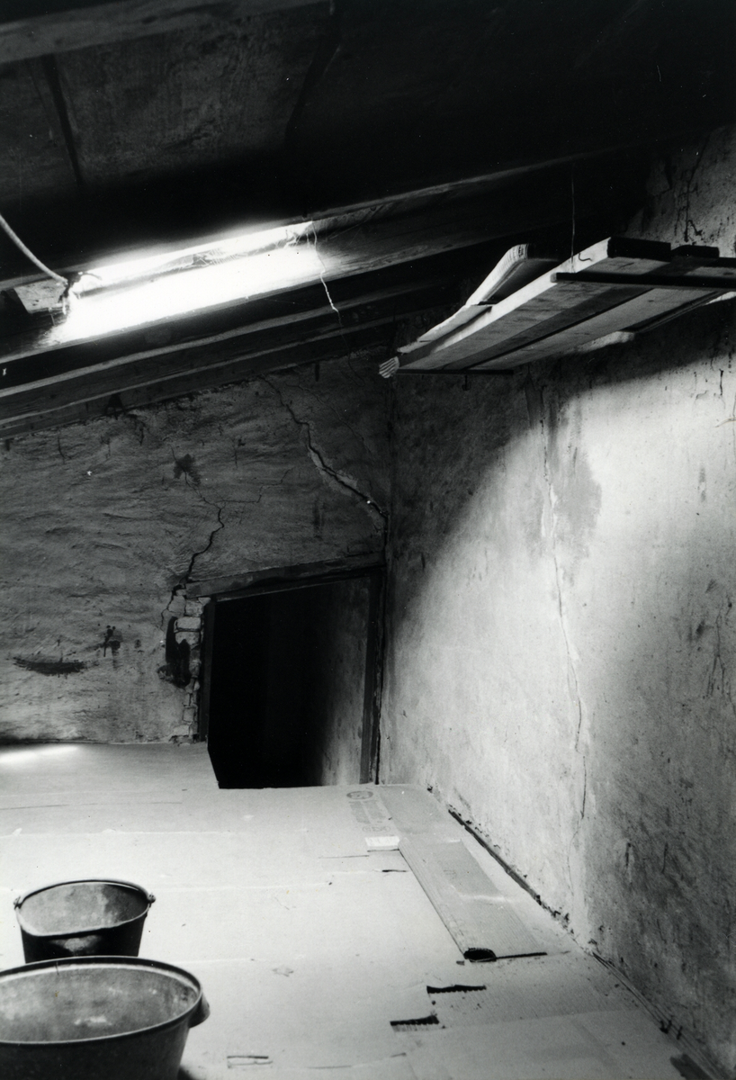 Vind över mellersta tillbygget. I fonden ingången,via det senaste tillbyggets långa vind.