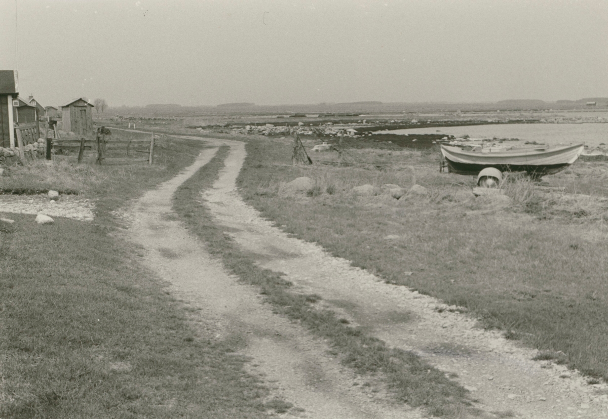 Fiskeläge i Gårdby. Sjöbodar, väg och båt vid kusten.