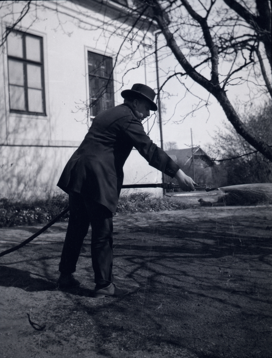 En herre med vattenslang på Tuna gård.