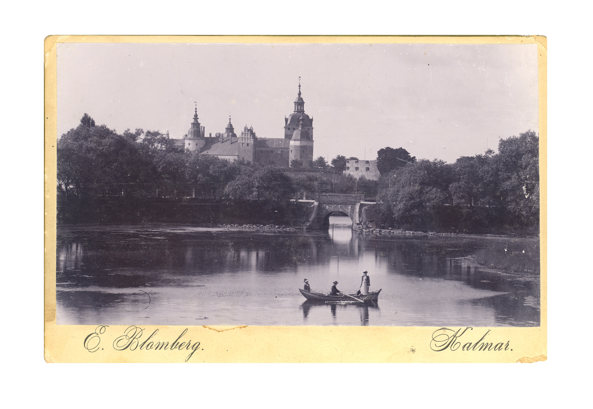 Vykort med Systraströmmen i förgrunden och Kalmar slott i bakgrunden.