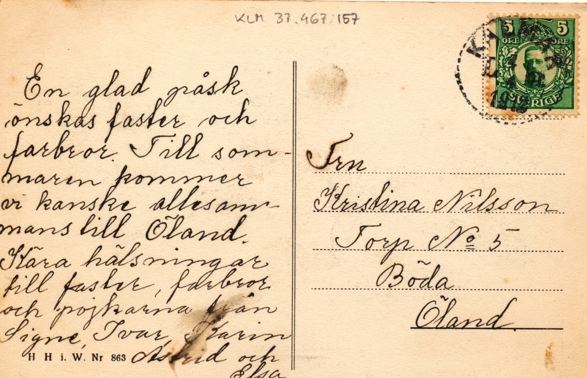 Ett påskkort till fru Kristina Nilsson, Torp no 5 i Böda på Öland.