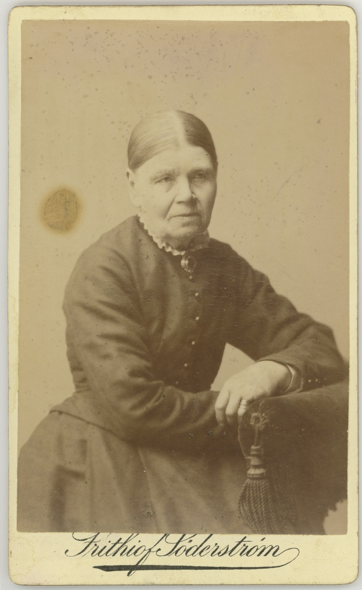 En kvinna i brosch och klänning.