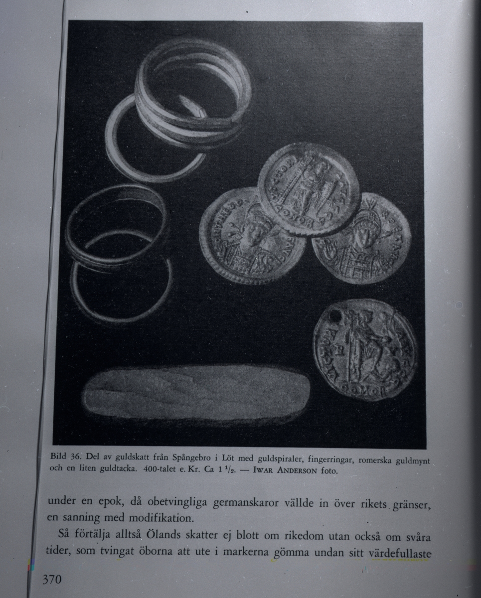 Del av guldskatt från Spångebro, Löt socken, med guldspiraler, fingerringar, romerska guldmynt och en liten guldtacka. 400-talet efter Kristus.