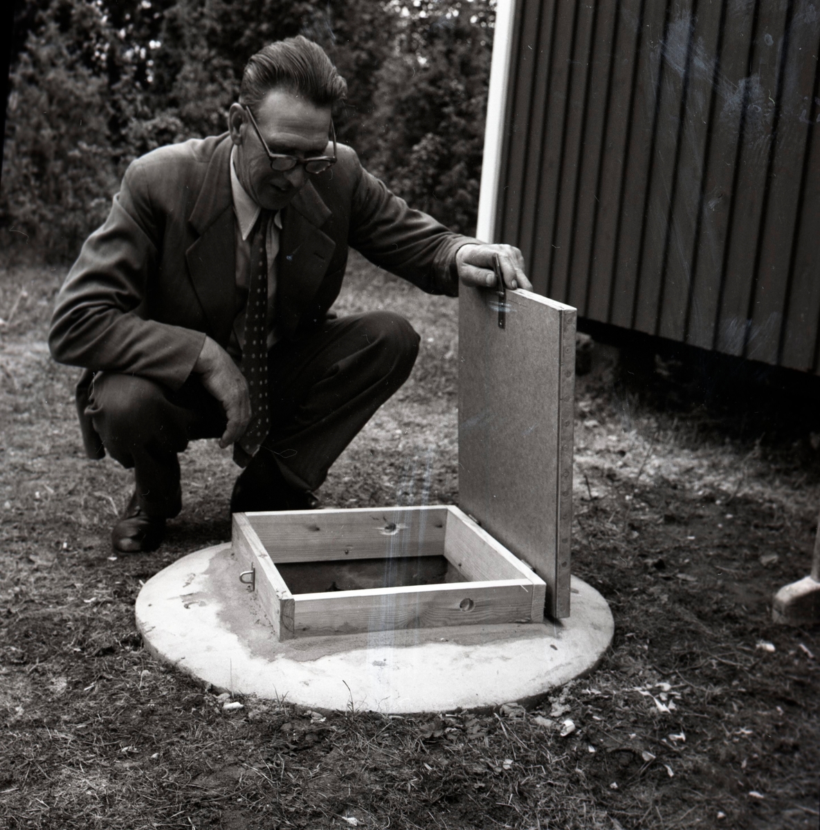 En man som tittar ner i en brunn vid en semesterstuga i Åkerby på Öland. 14/6 1960.
