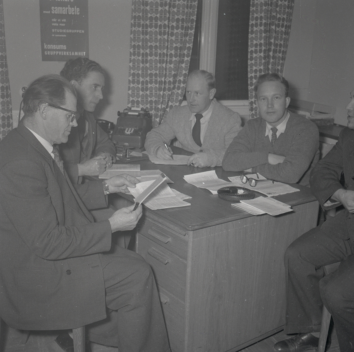 En studiegrupp. Text på plakat: "Det går lättare med samarbete när vi vill veta mer STUDIEGRUPPEN är [text oläslig] konsums GRUPPVERKSAMHET".