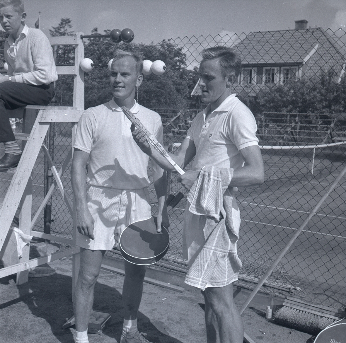Tennisfinaler och prisutdelning en måndag. Två tennisspelare och en pojke vid domarplatsen till vänster.