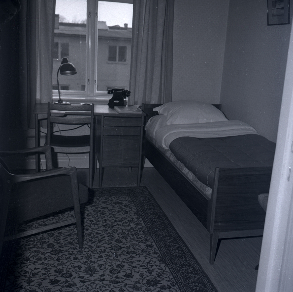 Stadshotellet inredning. Ett fönster med gardiner, en fåtölj, en arbetsbänk med stol, lampa och telefon och en säng.