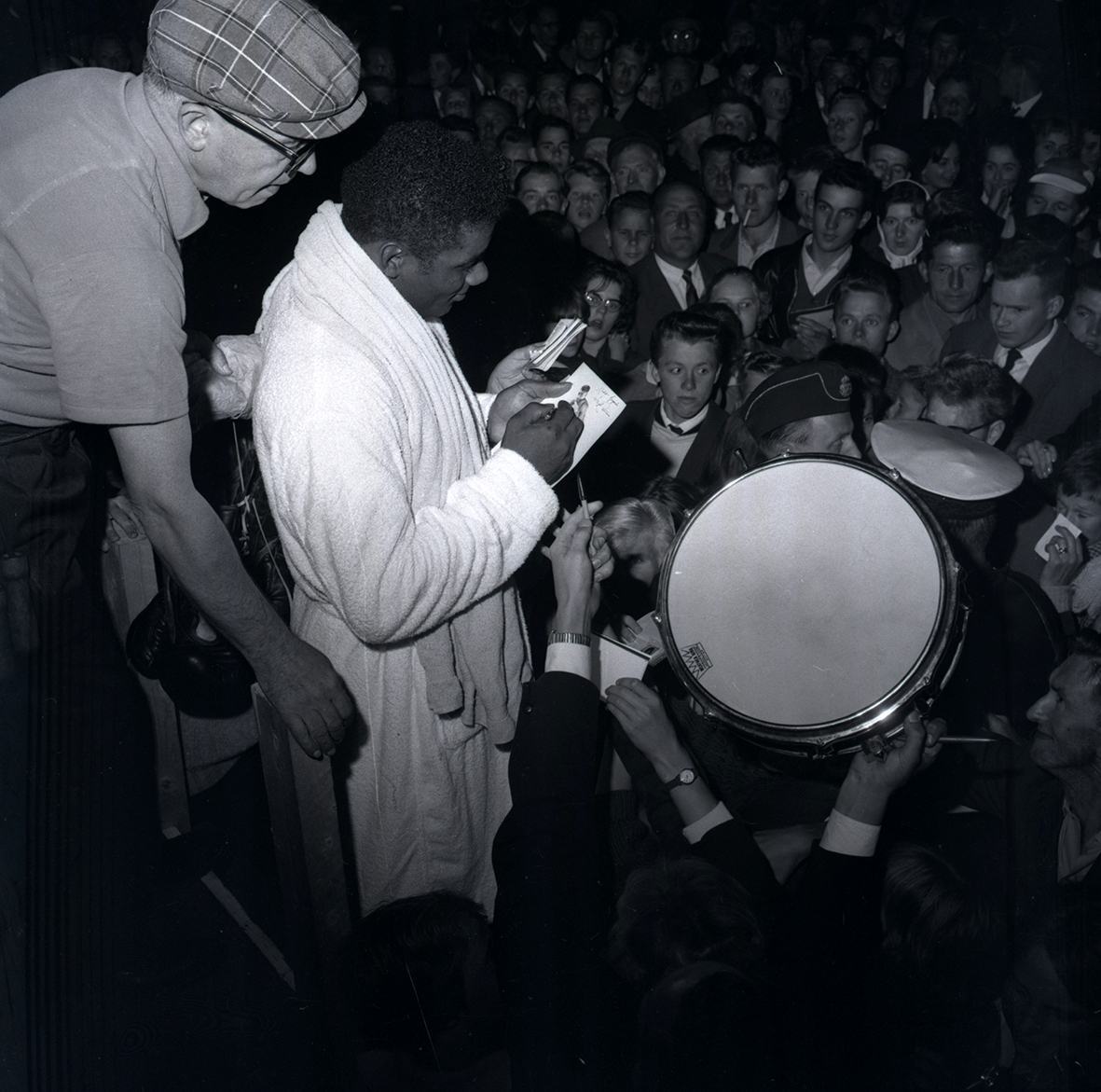Boxaren Floyd Pattersson skriver autografer inför publik.
