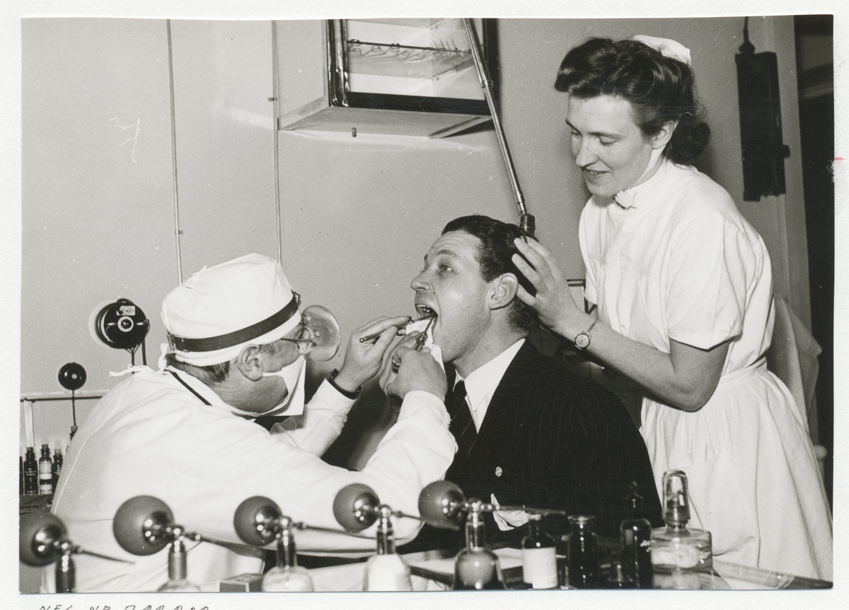 En man hos tandläkaren och en tandsköterska som stöttar.