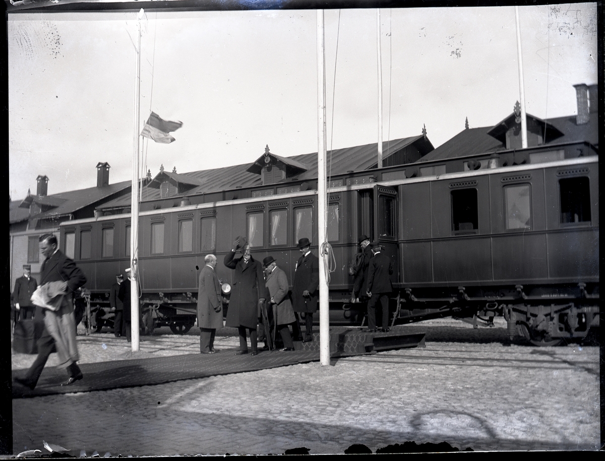 Kung Gustav V kliver av tåget vid Skeppsbron under ett besök i Kalmar.