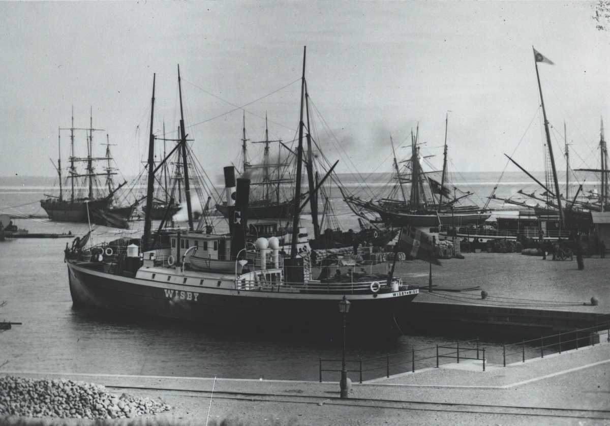 Vy över Tullhamnen med Gotlandsbolagets postångare Wisby i förgrunden och segelskutor i bakgrunden.