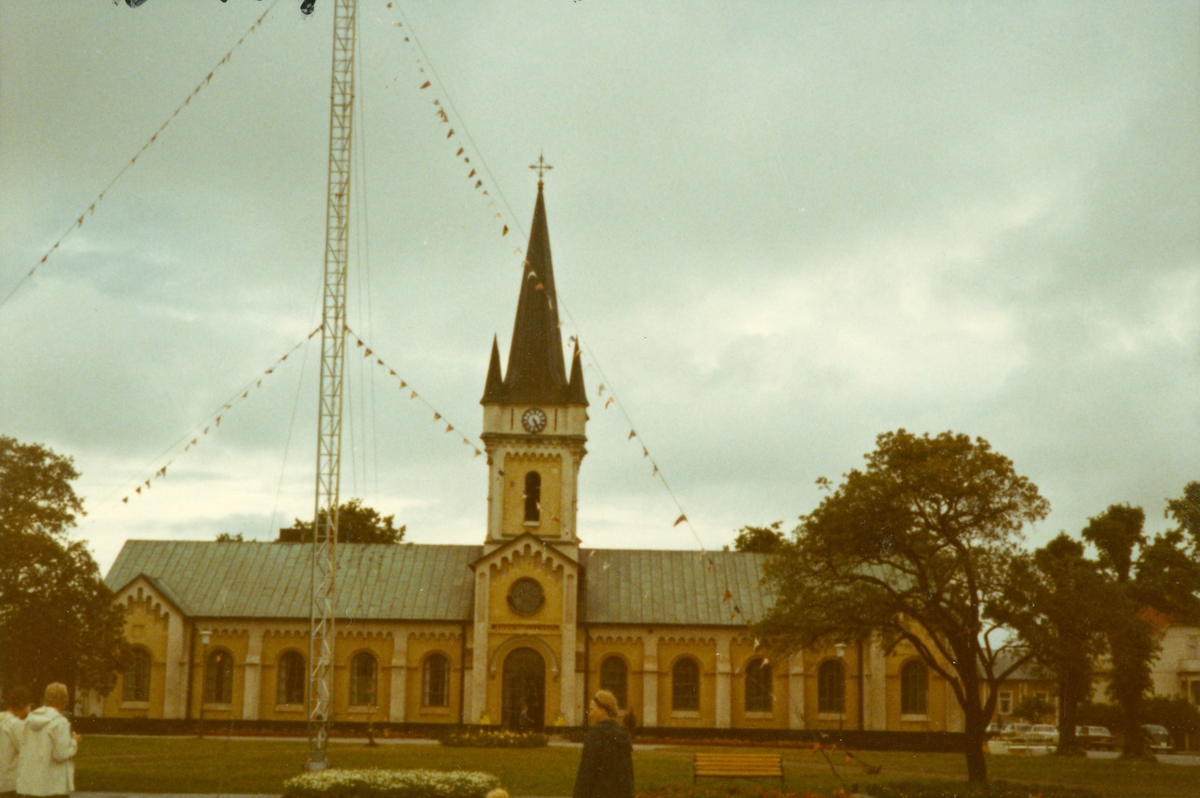 Borgholms kyrka, med ett flaggspel uppsatt framför kyrkan.