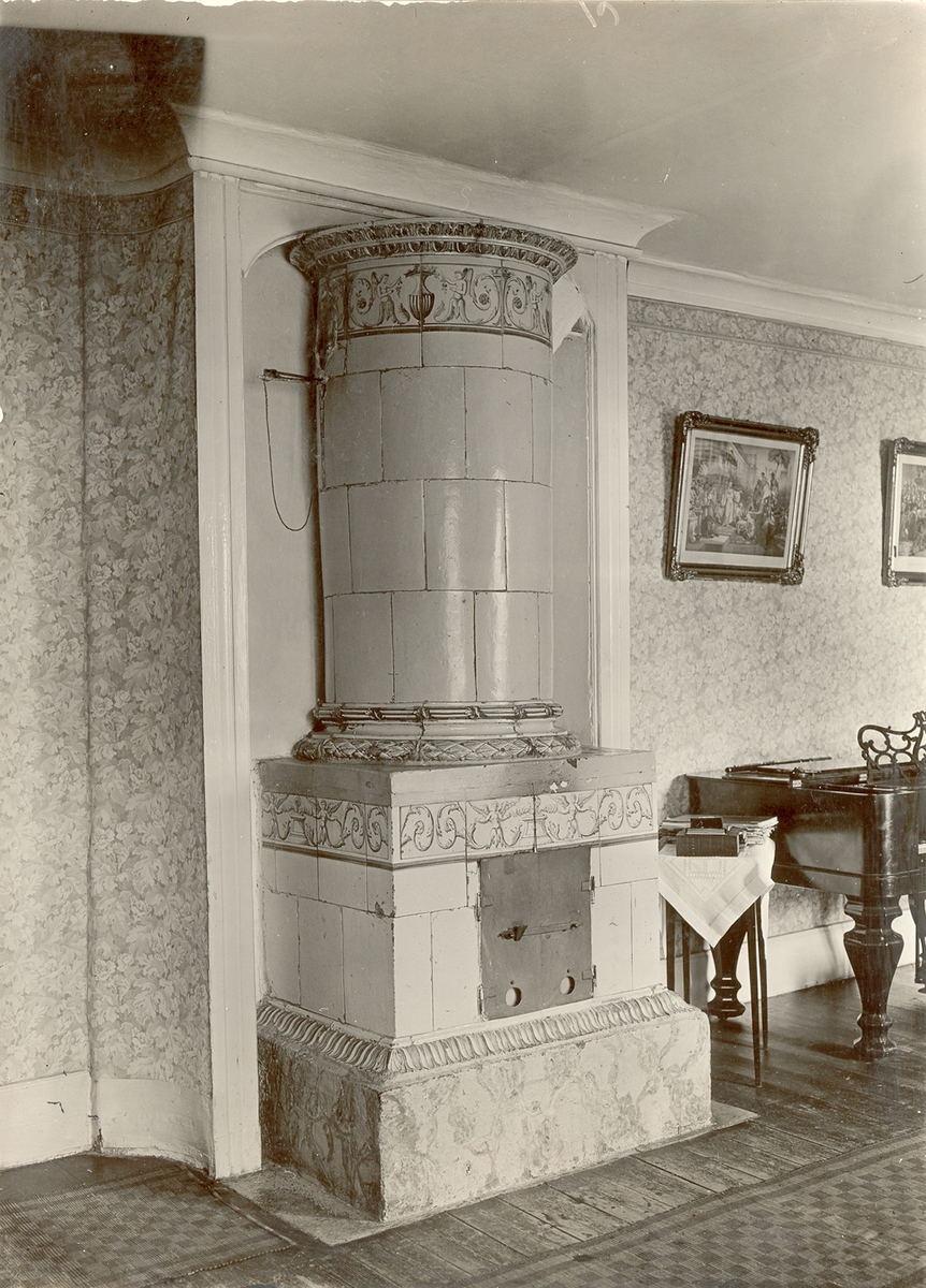 Huvudbyggningen i bottenvåningen på Kärrstorp. Kolonnugn i rummet t.v om förstugan. Sockeln marmorerad i blått. Plinten med blå dekor på vitt kakel. Kolonn med dekor i grönt, gult och blått på grönt kakel. Nisch med träfoder.