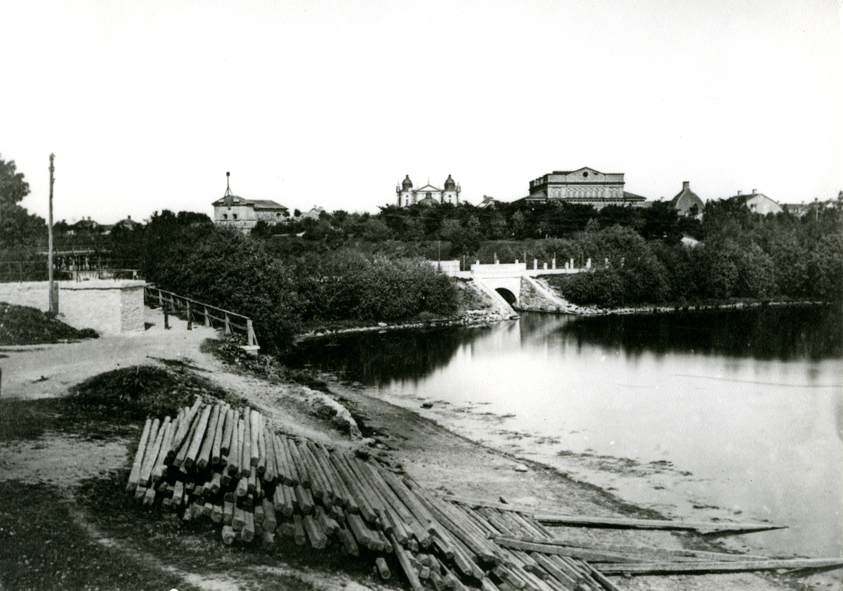 Kvarnholmen med Västerbron, sedd från parken. Fotografiet är taget omkring 1865 då Teatern är färdig och Kockska huset ännu inte är rivet.
