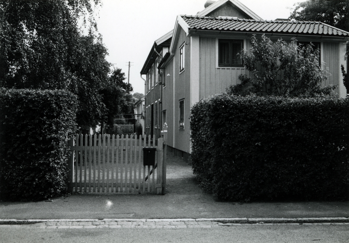 Bostäder i kv. Akacian 6, omgärdat av häckar och grind.