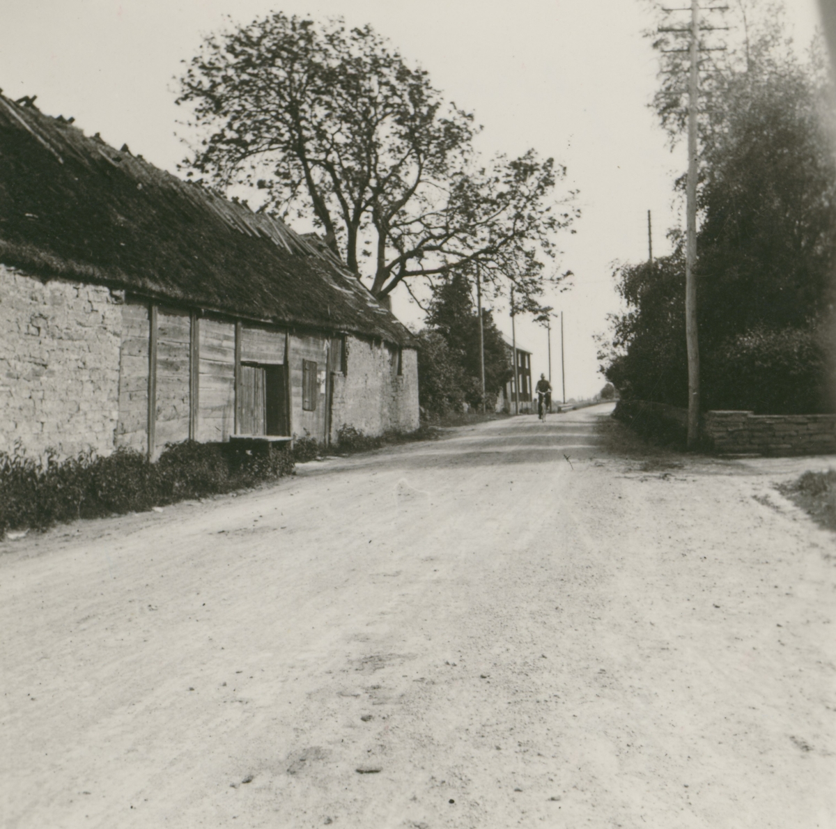 Danjel Pers byggnation. En ekonomibyggnad och en cyklist på en väg.