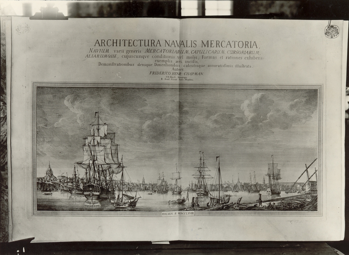 Försättsbild till af Chapmans planschverk för skeppsbyggeri "Architectura Navalis Mercatoria."