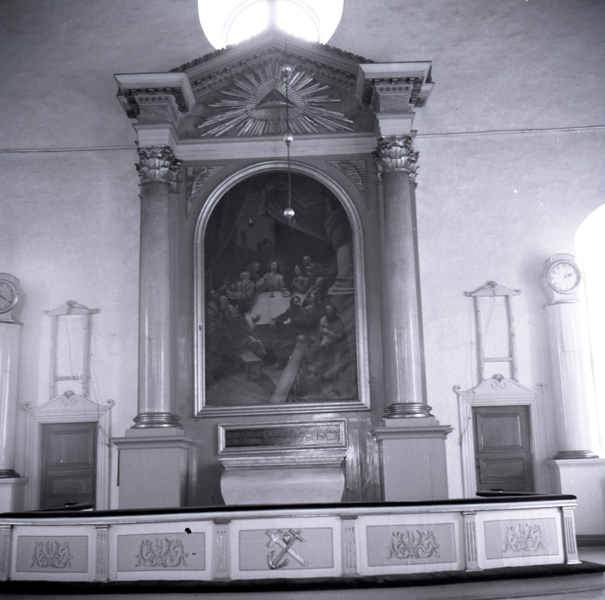 Alböke kyrka under renovering. Altaret med altartavlan.