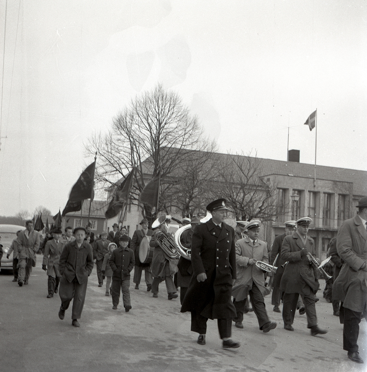 Första majtåg med mässingsorkester passerar Borgholms rådhus vid torget.