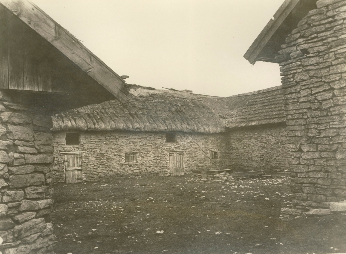 Ladugård av kalksten, fyrsidigt kringbyggd, och försedd med halmtak.