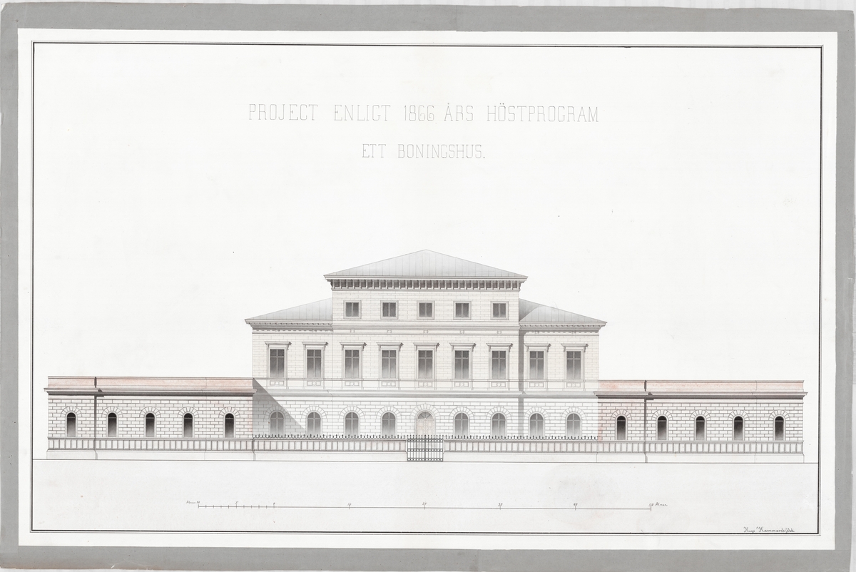 Kolorerad arkitektritning av Hugo Hammarskjöld. Projekt enligt 1866 års höstprogram under skoltiden i Stockholm. Ett boningshus.